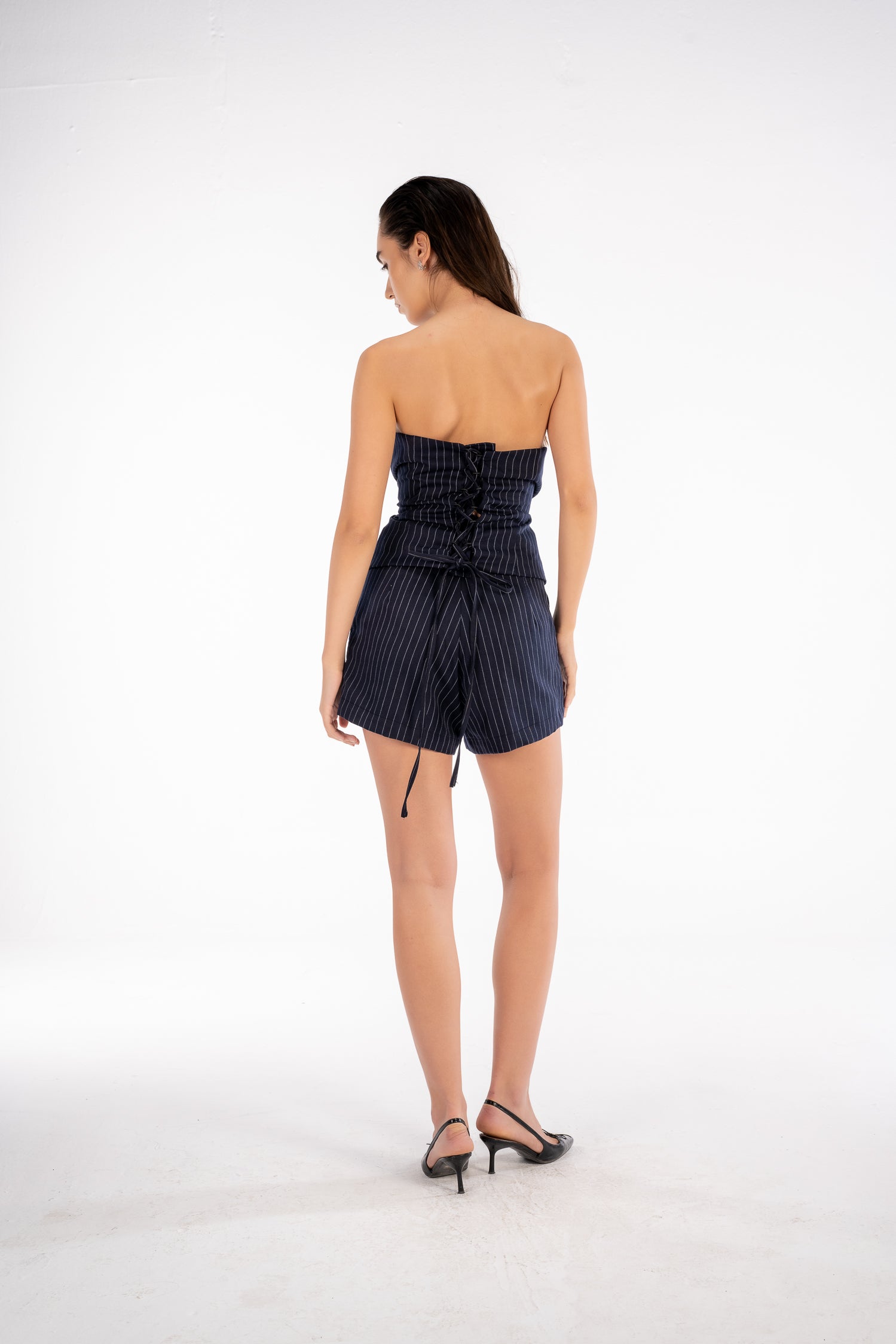 Designed for long, balmy evenings, The Riviera Set pairs soft tailoring with subtle detail. The top features a cross-back design with delicate ties that let you adjust and cinch the fit at the waist — creating a flattering, shaped silhouette without effort. Paired with matching high-waisted shorts in a classic navy stripe, this set moves easily from laid-back afternoons to elevated summer nights.