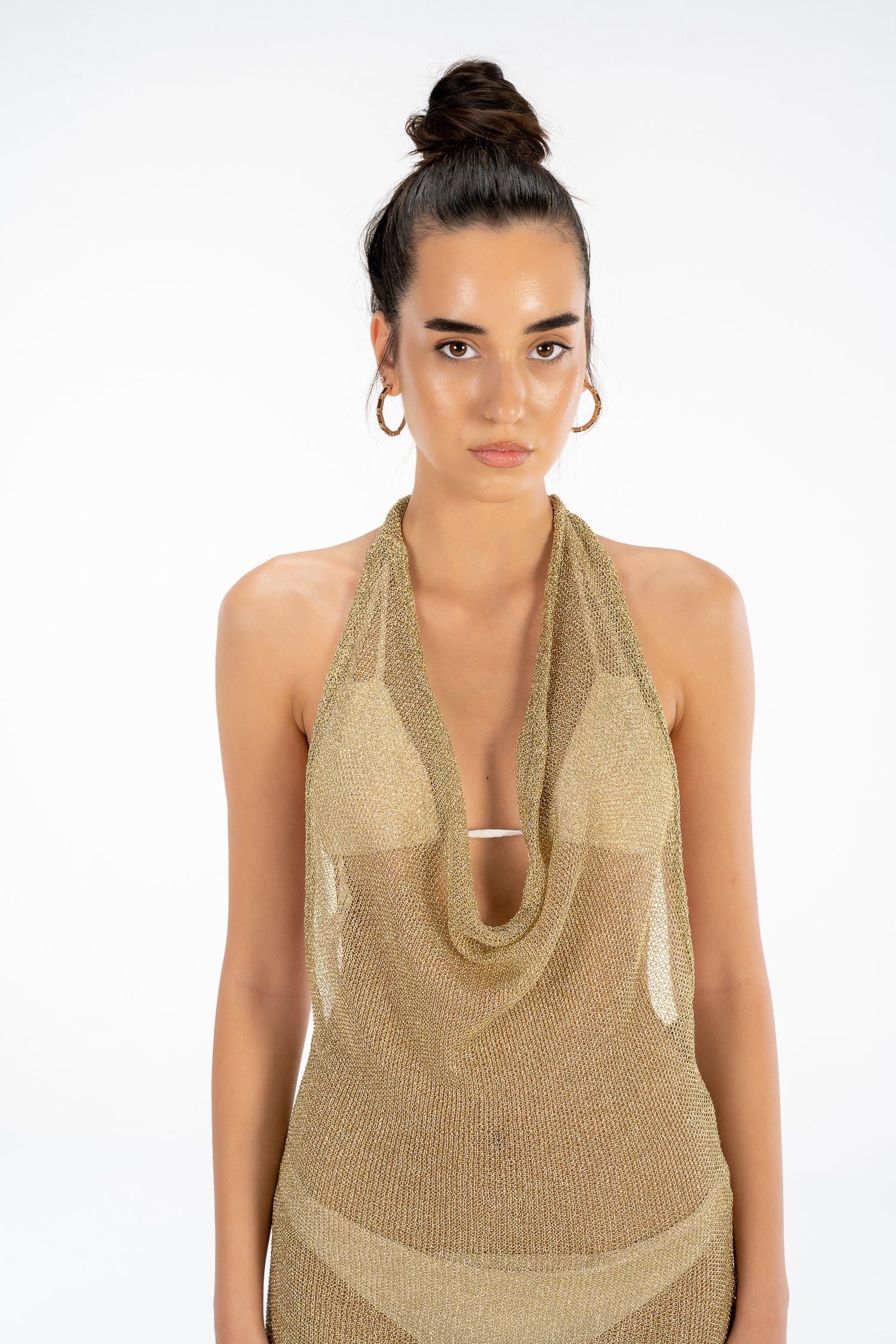The Sunveil Dress is a backless cover-up designed to catch the light and float effortlessly with every step. Crafted to drape like a second skin, its shimmering gold fabric was made for beachside mornings, barefoot afternoons, and poolside gatherings that turn into golden hours.